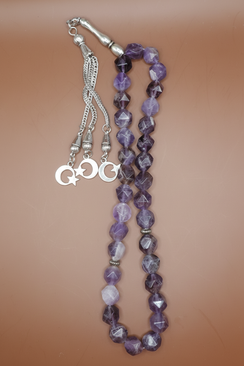 Discover spiritual serenity with our exquisite Amethyst Tasbih, a masterpiece that unites devotion with the calming energy of genuine amethyst gemstones. This elegant prayer bead strand features 33 carefully selected amethyst beads, showcasing the stone's signature purple hues ranging from soft lavender to deep violet.