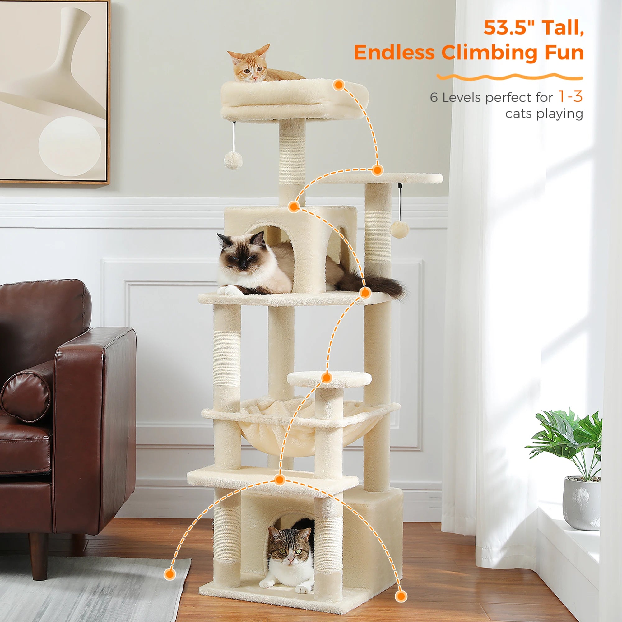 Large Cat Tree Tower with Sisal Scratching Posts Multiple levels with spacious hammock and padded perches Sisal-covered scratching posts protect...