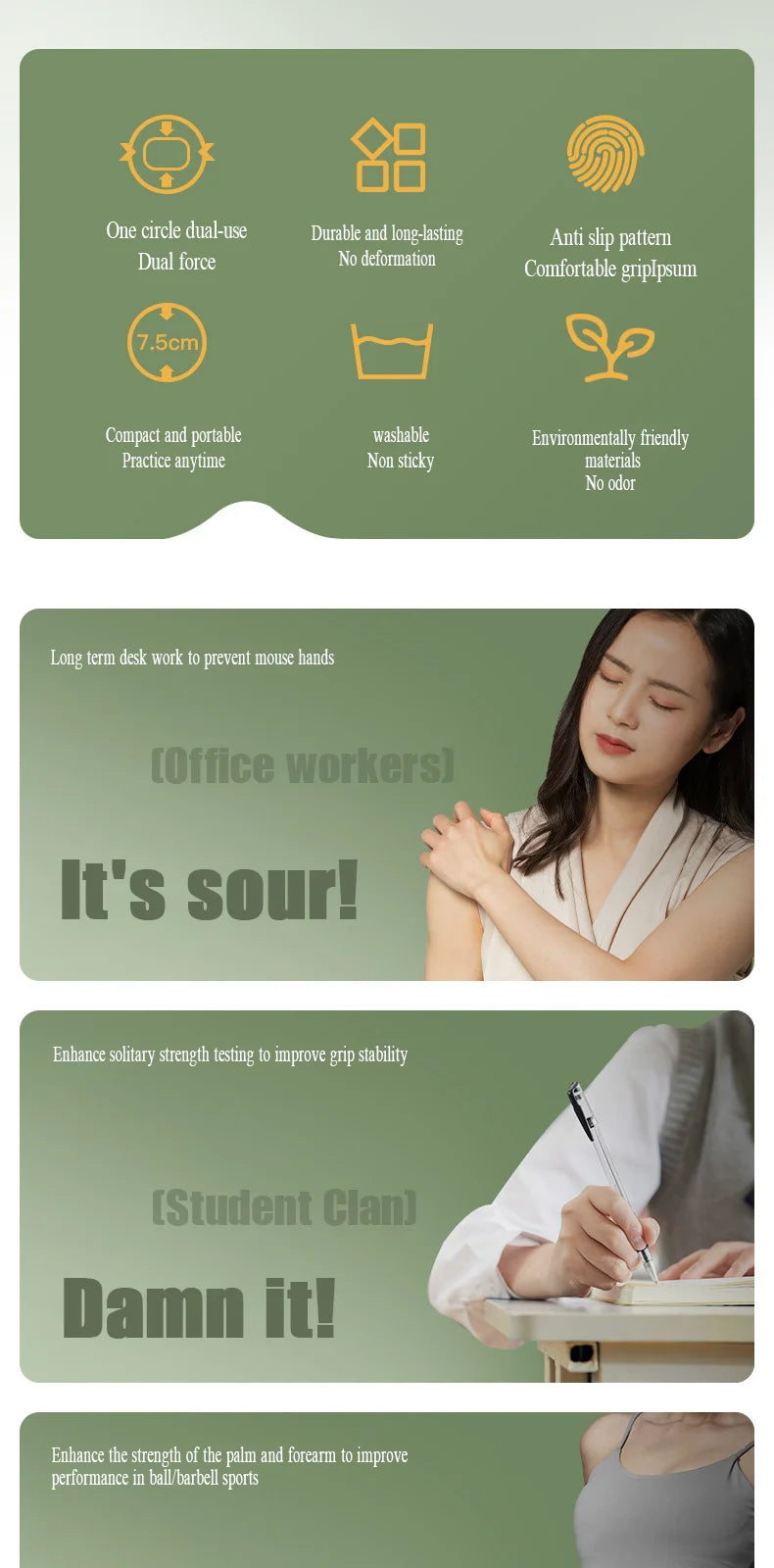 Product form Silicone Finger Gripper $6.23 Silicone Finger Grip Strengthener Dual-direction resistance with 6 resistance levels (6.6-21LB) High-quality silicone construction that maintains shape Compact and washable... Color 40-80LB-2pcs Add to cart This item is a recurring or deferred purchase. By continuing, I agree to the cancellation policy and authorize you to charge my payment method at the prices, frequency and dates listed on this page until my order is fulfilled or I cancel, if permitted. Share with your friends Share WhatsApp Deel X Pin it Messenger Email