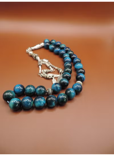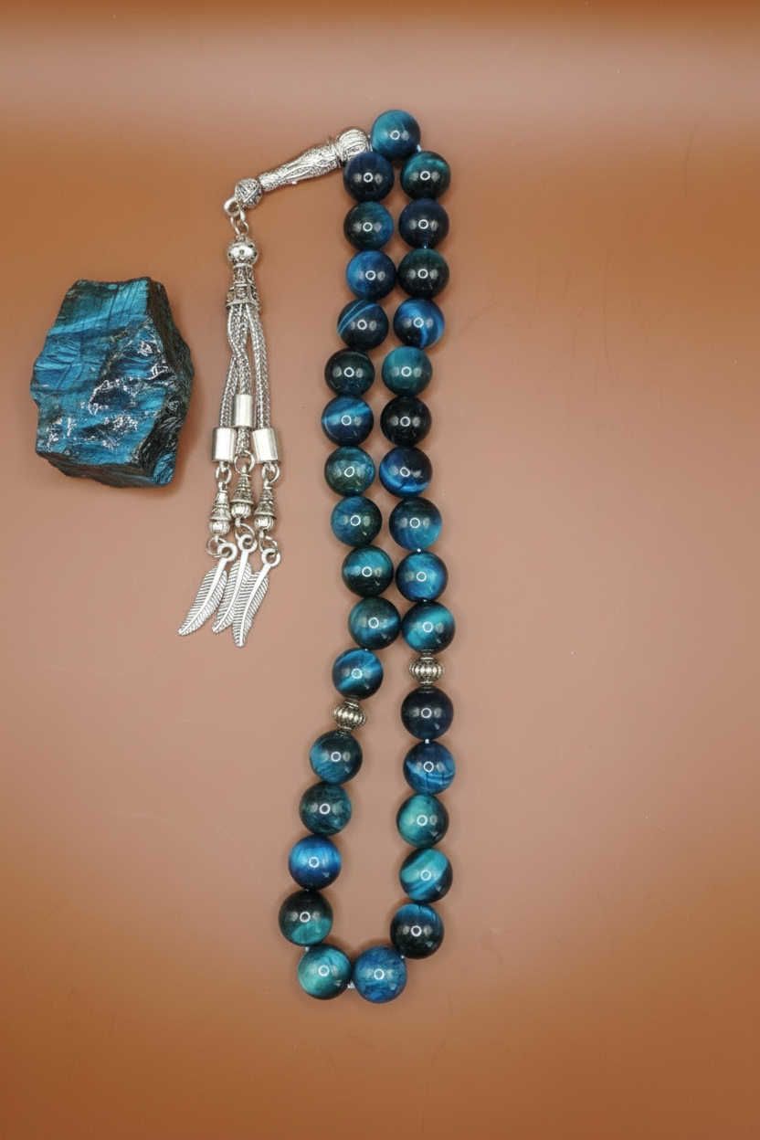Experience the captivating beauty of our Teal Tiger Eye Tasbih Prayer Beads, handcrafted with 33 luminous gemstone beads in mesmerizing shades of turquoise and teal. Each bead showcases the natural chatoyancy (cat's eye effect) that tiger eye is renowned for, creating a beautiful shimmer as light dances across the polished surface.